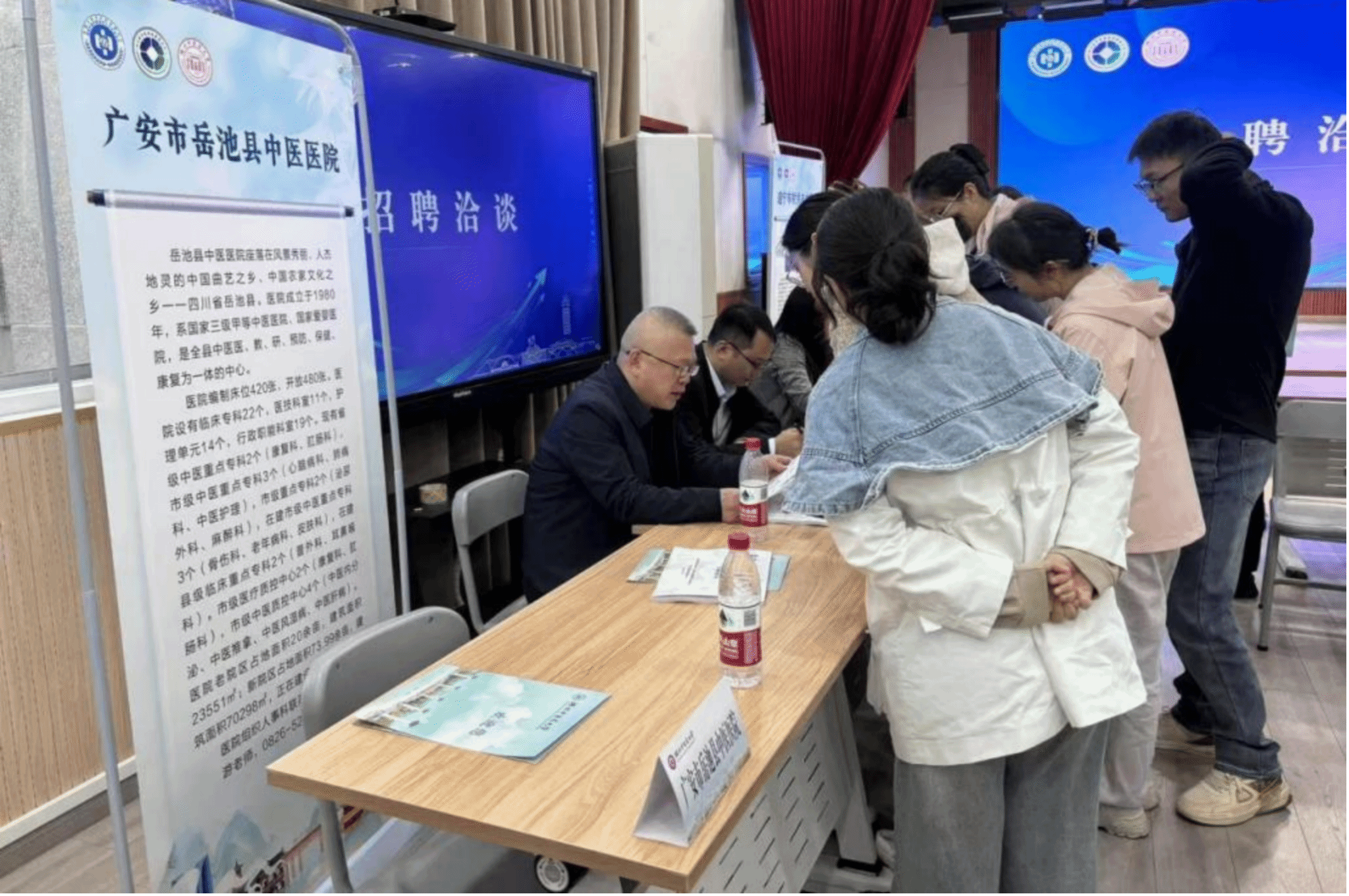在专场宣讲环节,遂宁市中医院、资阳市中医医院等7家医疗单位围绕医院概况、岗位需求与人才政策进行了推介宣讲。宣讲结束后,各医院代表在指定咨询点与毕业生进行一对一交流,同学们积极投递简历,主动咨询岗位信息,现场互动气氛热烈。