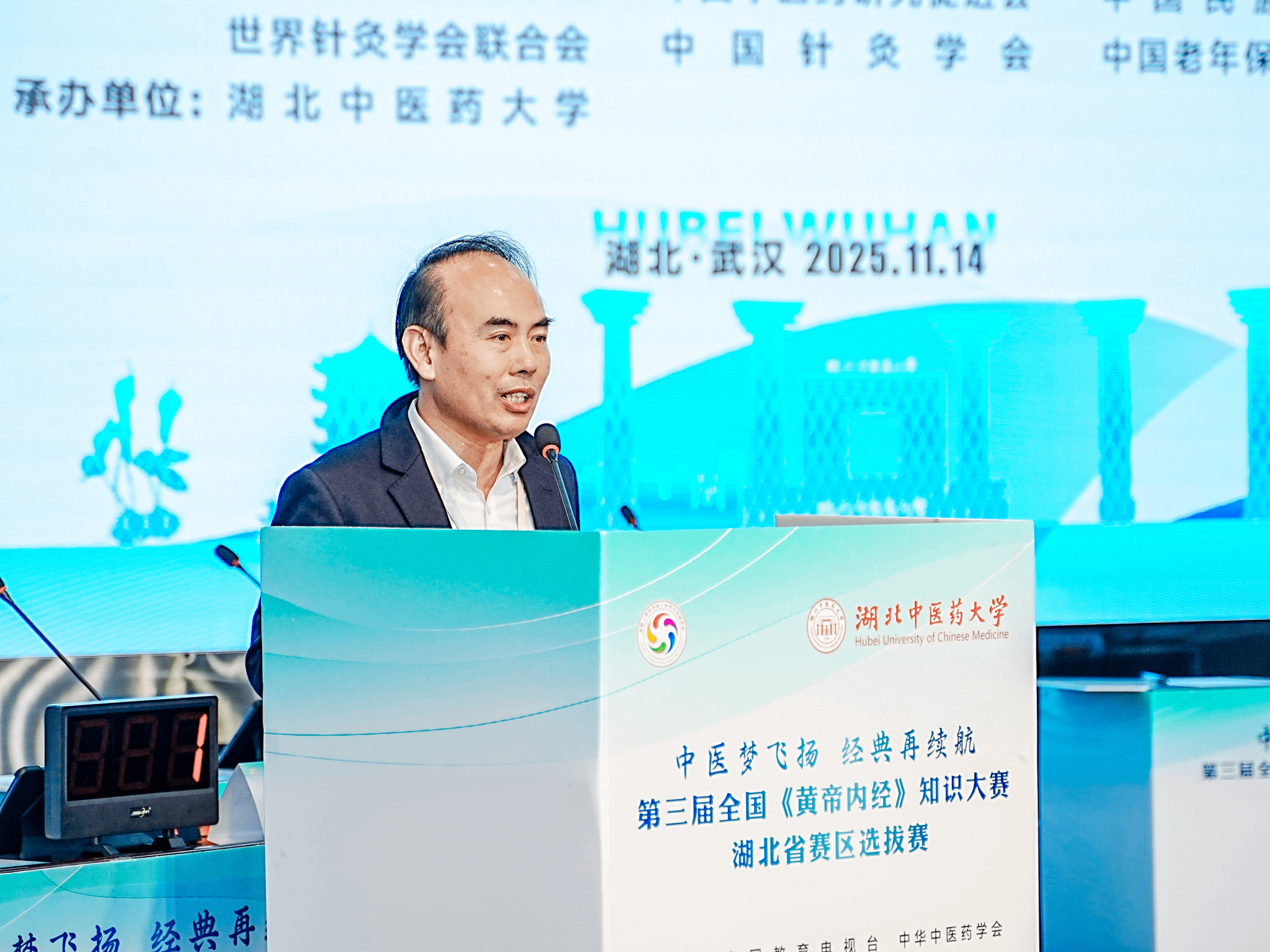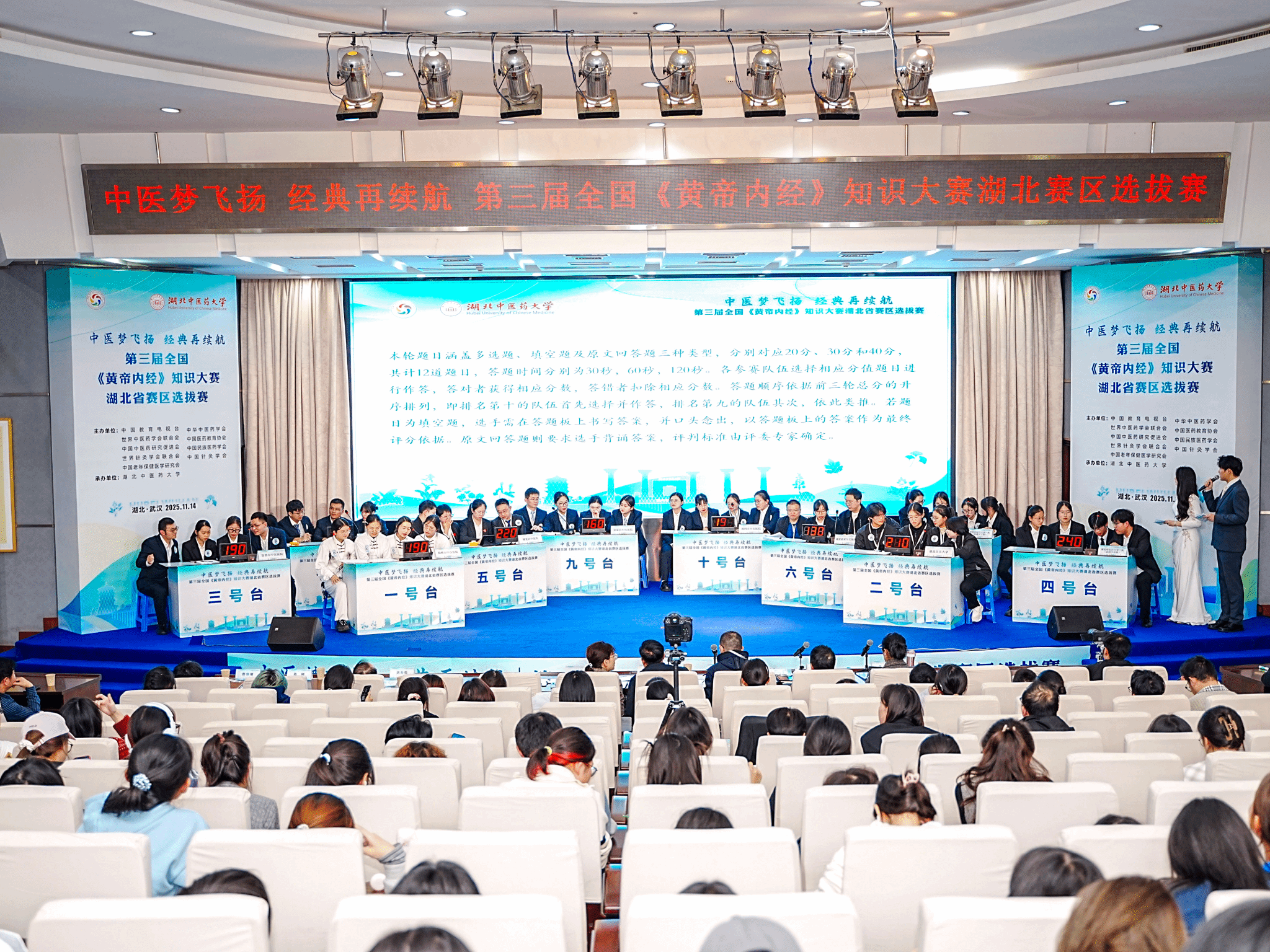 本网讯 11月14日,第三届全国《黄帝内经》知识大赛湖北省赛区选拔赛在学校黄家湖校区明德楼学术报告厅举行。本次比赛由全国中医药高等教育学会、中华中医药学会、世界中医药学会联合会、中国教育电视台等单位联合主办,学校承办,湖北国药中联医药有限公司支持。来自全省18个单位的19支队伍同台竞技,共溯医典之源,共扬岐黄之术。