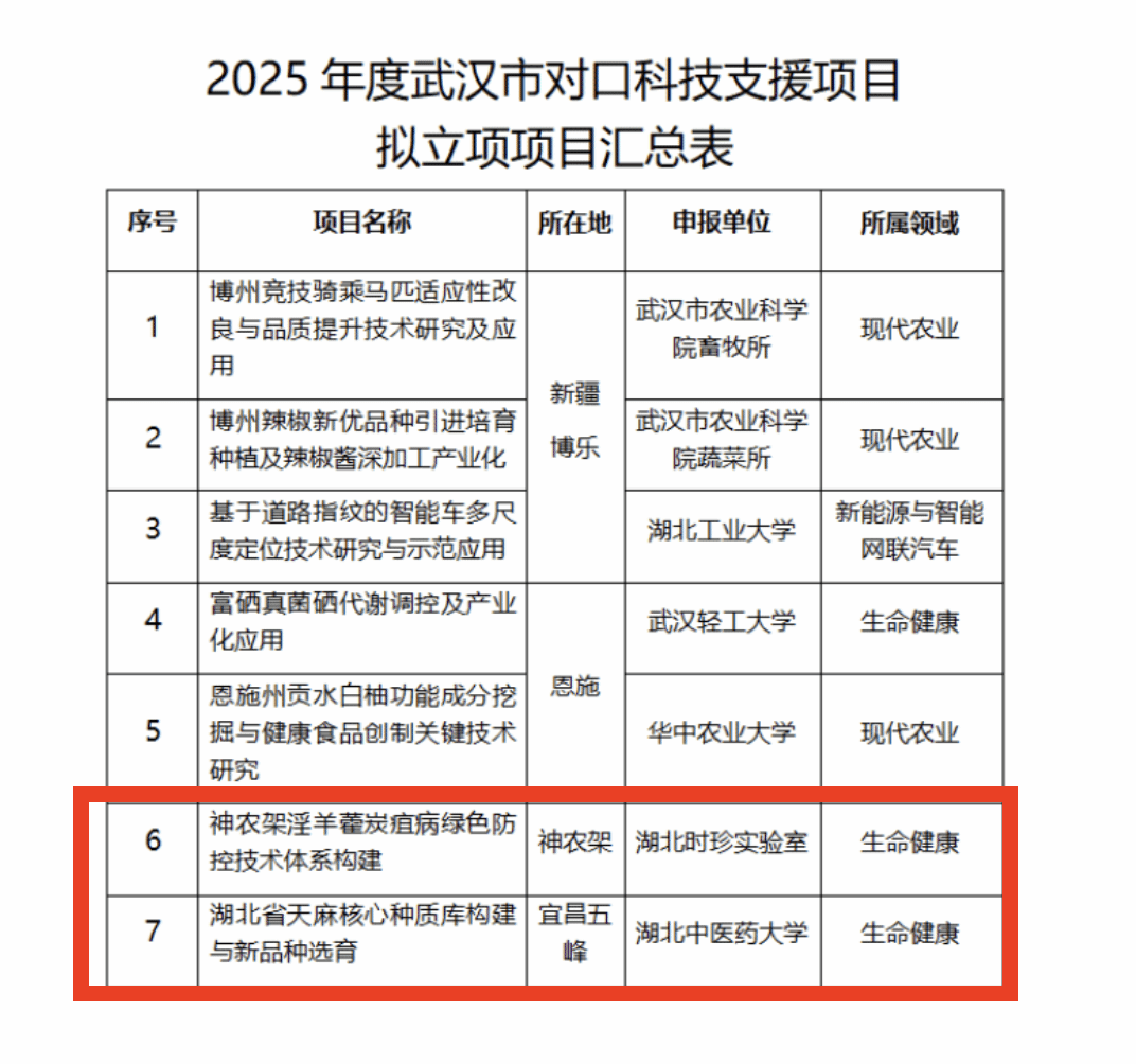 本网讯 近日,武汉市科创局公布2025年度武汉市对口科技支援立项项目。学校、湖北时珍实验室分别获批立项,项目总投入230万,科研立项支持金额70万。