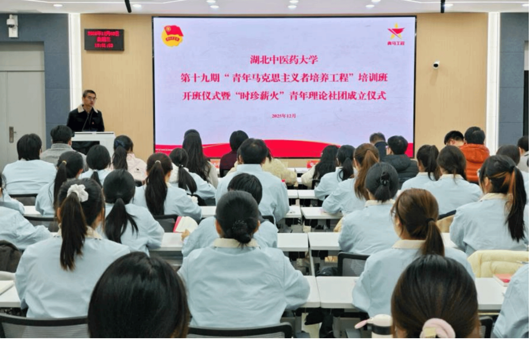 本网讯 为深入学习贯彻党的二十届四中全会精神,引导青年学生增强历史自觉、勇担时代使命,近日,学校第十九期“青年马克思主义者培养工程”(以下简称“青马工程”)培训班开班活动暨“时珍薪火”青年理论社团成立仪式在本草苑Y102举行,党委副书记杨波出席活动,校团委负责人,学生工作部(处)、马克思主义学院相关负责人,各学院团委书记及第十九期“青马工程”培训班全体成员参加活动。校团委相关负责人主持开班式。