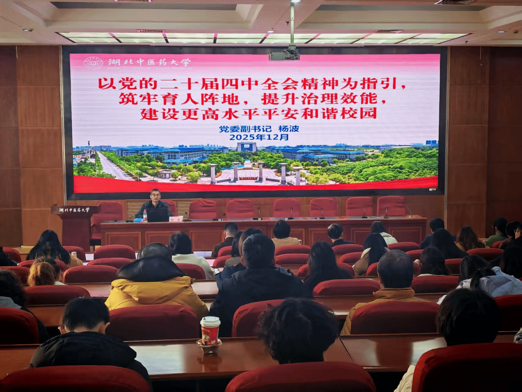 本网讯 12月18日,党委副书记杨波在黄家湖校区宣讲党的二十届四中全会精神。宣传部党支部、学工团委党支部、保卫处党支部、财务处党支部全体党员,检验学院全体教职工及学生代表参加宣讲报告会。
