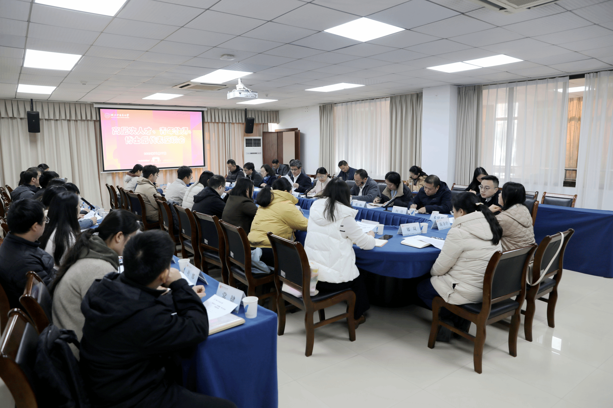 本网讯 12月17日,学校在黄家湖校区召开高层次人才、青年教师、博士后代表座谈会。党委书记刘松林,党委副书记、副校长蔡晓英,18名高层次人才、17名青年教师、博士后代表,党委组织部、党委宣传部、发展规划与学科建设办公室、人事处、教务处、科学技术发展研究院、研究生院、财务处、资产与实验室管理处、后勤管理处等部门相关负责人参加会议。蔡晓英主持会议。