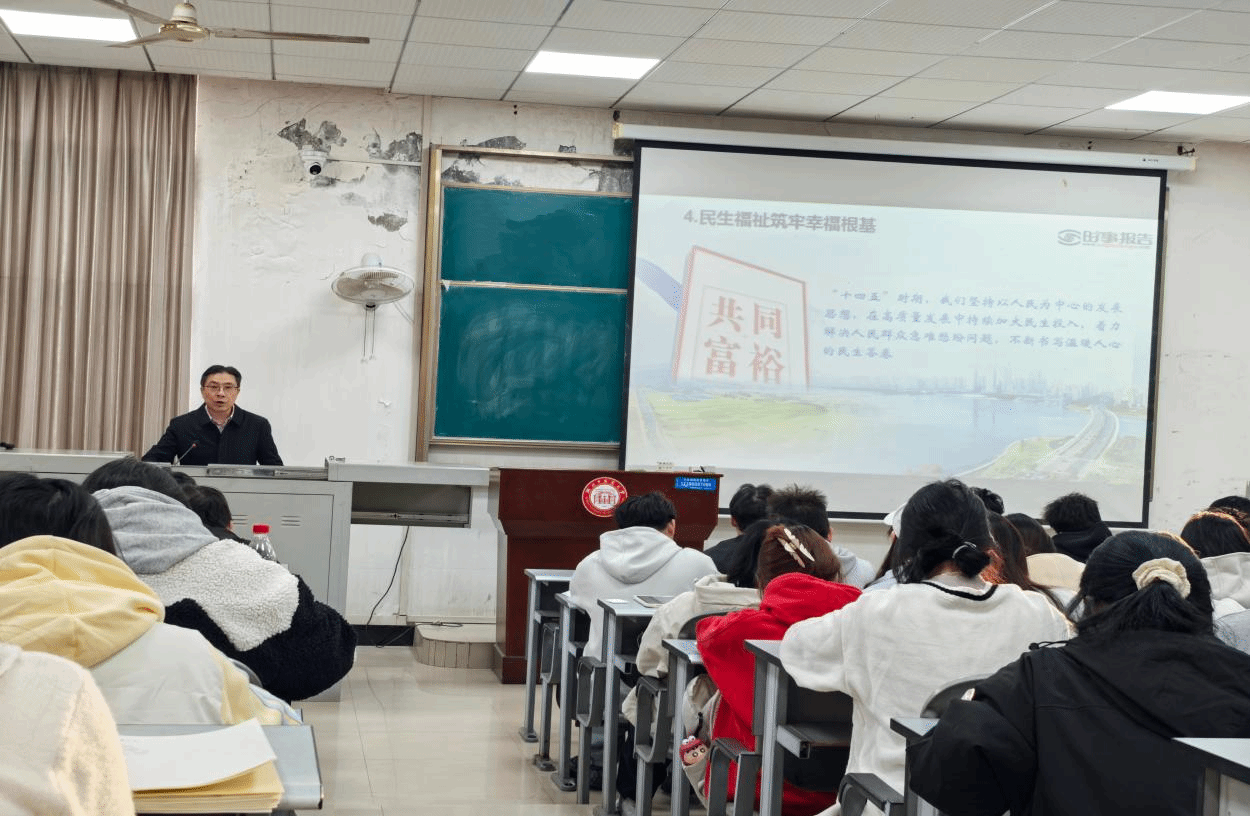 副校长刘建忠为2024级公共事业管理、国际商务、物流管理班学生授课。他系统梳理了“十四五”时期的经济社会发展成就,围绕中医药行业发展趋势,解读了国家政策与学校实践成果,并围绕中医药产业数字化转型、中西医协同创新等方向,寄语青年学子在“十五五”的新征程中勇挑重担。