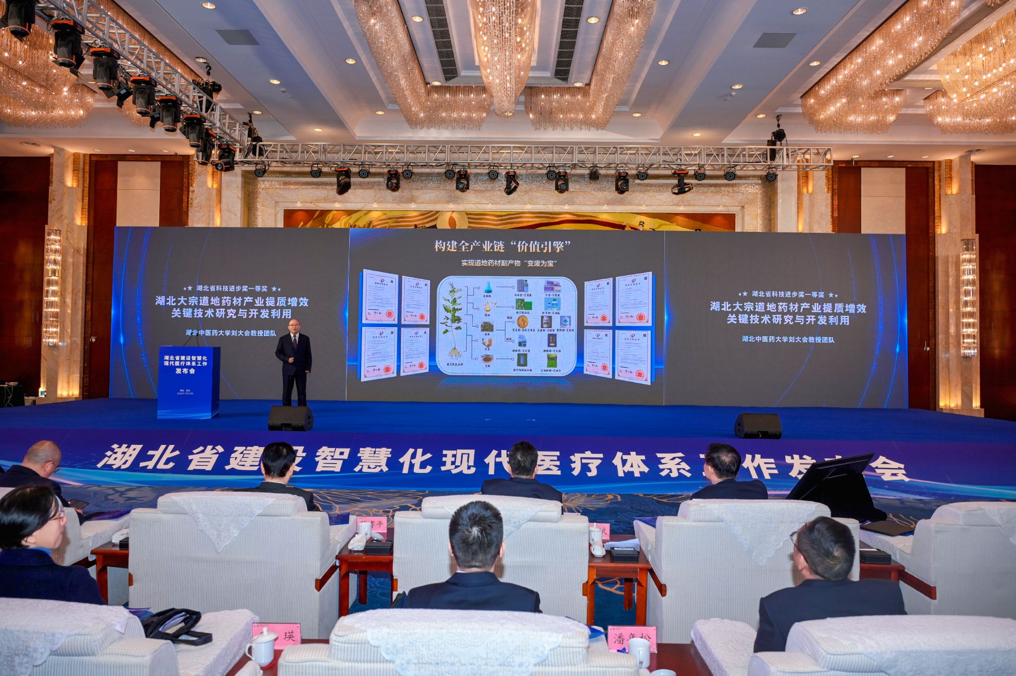 本网讯 1月21日,湖北省智慧化现代医疗体系建设发布会举行,会上发布6项医疗科技创新重大奖项成果,药学院教授、湖北时珍实验室研究员刘大会领衔的“湖北大宗道地药材产业提质增效关键技术研究与开发利用”项目入选。刘大会教授现场展示项目成果。