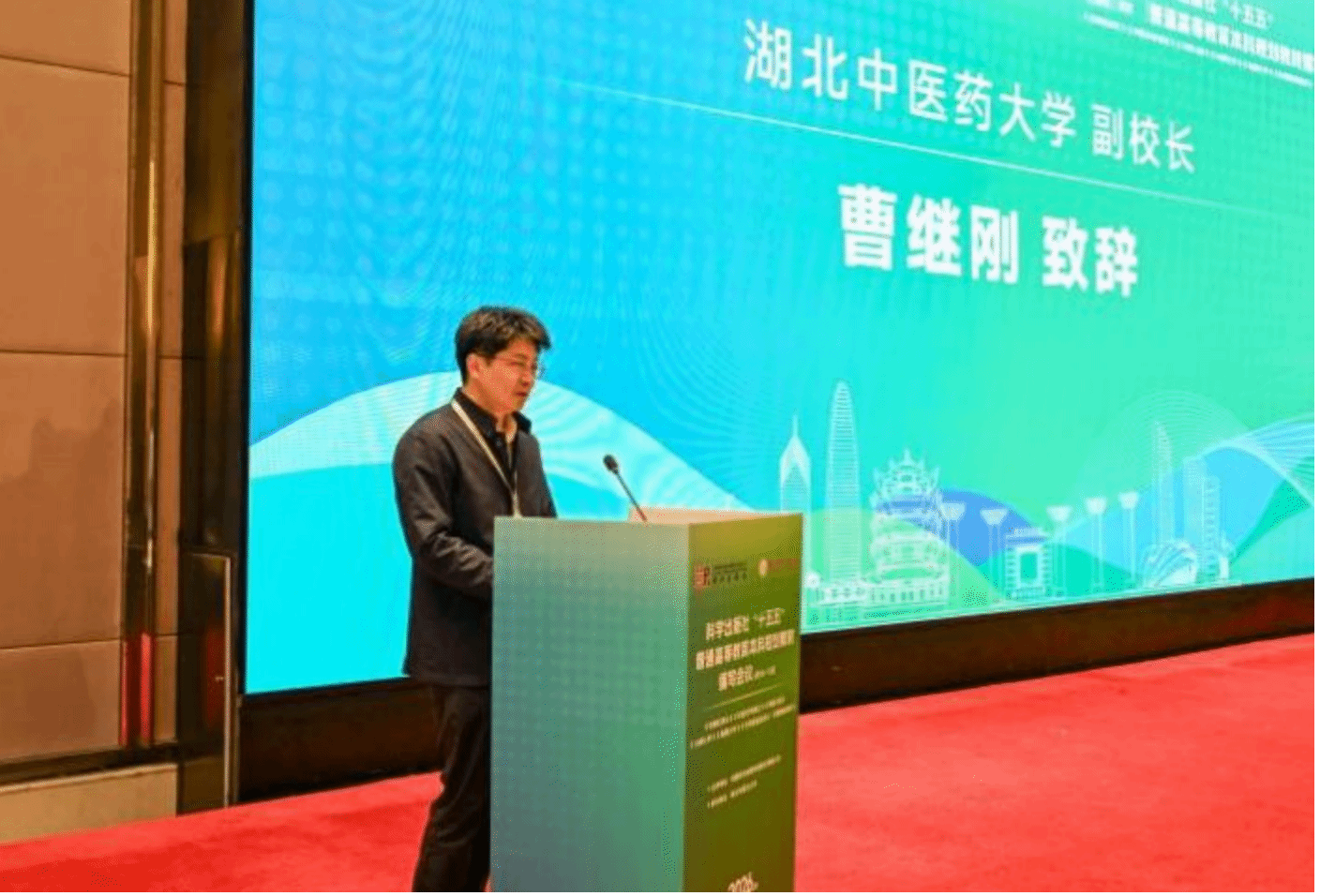 曹继刚在致辞中介绍了学校办学情况与教材建设成果。他指出,教材是知识传承的载体、人才培养的基石,更是教育质量的抓手,学校始终将课程思政贯穿教材建设全过程,将严格恪守教材编写规范,高质量完成编写任务,全力打造经得起检验的中医药精品教材。