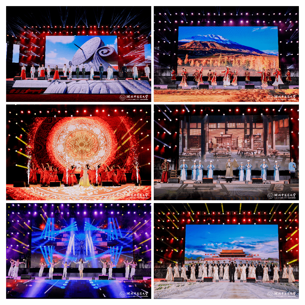晚会围绕“山河铭记·赤子心”“杏林赓续·承仁术”“奋进征程·向未来”三大篇章展开,融合舞蹈、器乐、朗诵、情景剧、武术、合唱等多种艺术形式,呈现了一场视听盛宴。开场舞《奔跑的青春》点燃全场;《一条大河》的优美舞姿与《四海平》的悠扬国乐,抒发了对祖国山河的热爱;《成为一束光》的深情朗诵与《有那么一个地方》的民族舞蹈,彰显了民族团结的力量。《本草绵延 生生不息》通过情景剧展现中医药文化的源远流长,《楚韵》以古典舞演绎荆楚文化的独特魅力;《太极拂晓 剑韵杏林》的传统武术表演彰显了医武相融的刚柔之美;《悬壶》通过舞蹈语言讲述医者仁心的故事;《日不落》《发如雪》则以歌舞表演展现艺术的多元性;《向阳而生》《奔涌后浪》以舞蹈展现青春活力,《杏林深处 数智花开》通过小品演绎医科融合的开拓创新,《正青春》以歌舞传递时代强音。晚会在合唱《如愿》《想见你》《歌唱祖国》中圆满落幕,表达了师生对祖国的美好祝福。