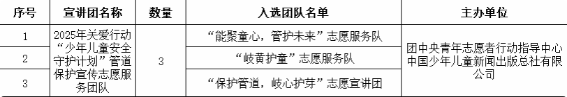 本网讯 近日,团中央青年志愿者行动指导中心、中国少年儿童新闻出版总社有限公司联合国家石油天然气管网集团有限公司共同举办了2025年关爱行动“少年儿童安全守护计划”管道保护宣传志愿服务团队遴选活动,我校第一临床学院3支学生团队成功入选。