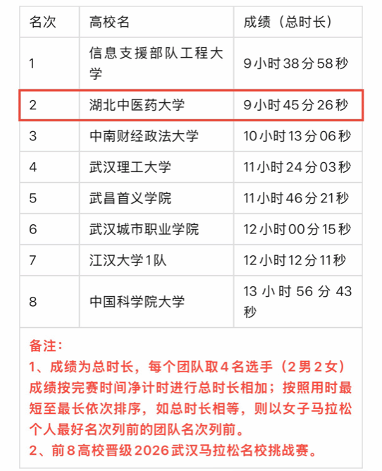 本网讯 近日,2025光谷马拉松鸣枪起跑,13000余名来自全国各地的跑者满怀激情向终点进发。由我校柯宪章、邓蕊、王启航、李静文四位同学组成的代表队,以总时长9小时45分26秒获高校挑战赛第二的好成绩,直通2026年武汉马拉松名校挑战赛。