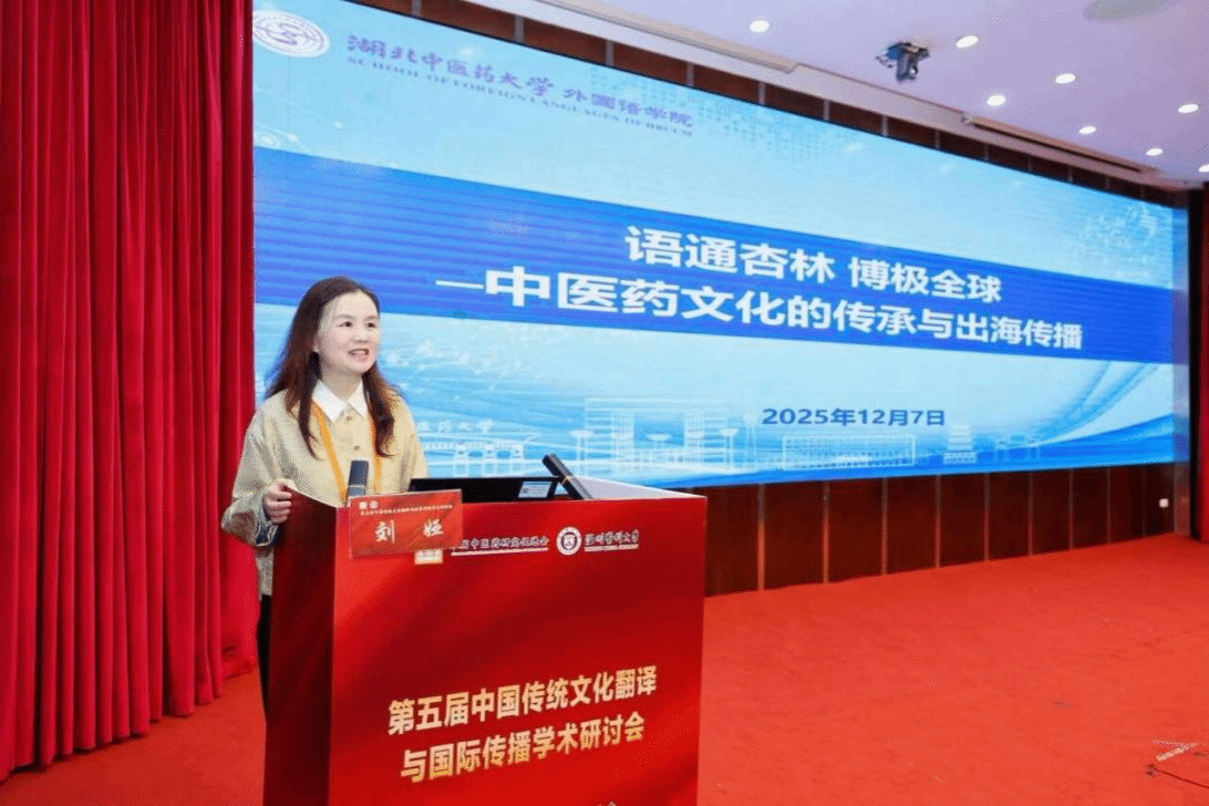 刘娅教授受邀作题为“语通杏林 博极全球——中医药文化的传承与出海传播”的主旨报告。她指出,AI与数字技术的发展对中医药文化对外传播带来了新的机遇与挑战。目前,生成式 AI 正在重塑翻译模式,中医药语言服务的需求也在不断攀升,要推动“翻译共同体”向“出海共同体”转型,整合互联网、大数据等技术,构建多维度传播体系,依托海外合作中心与“一带一路”等平台,优化术语标准,以政产学研协同打造多位一体传播新格局。