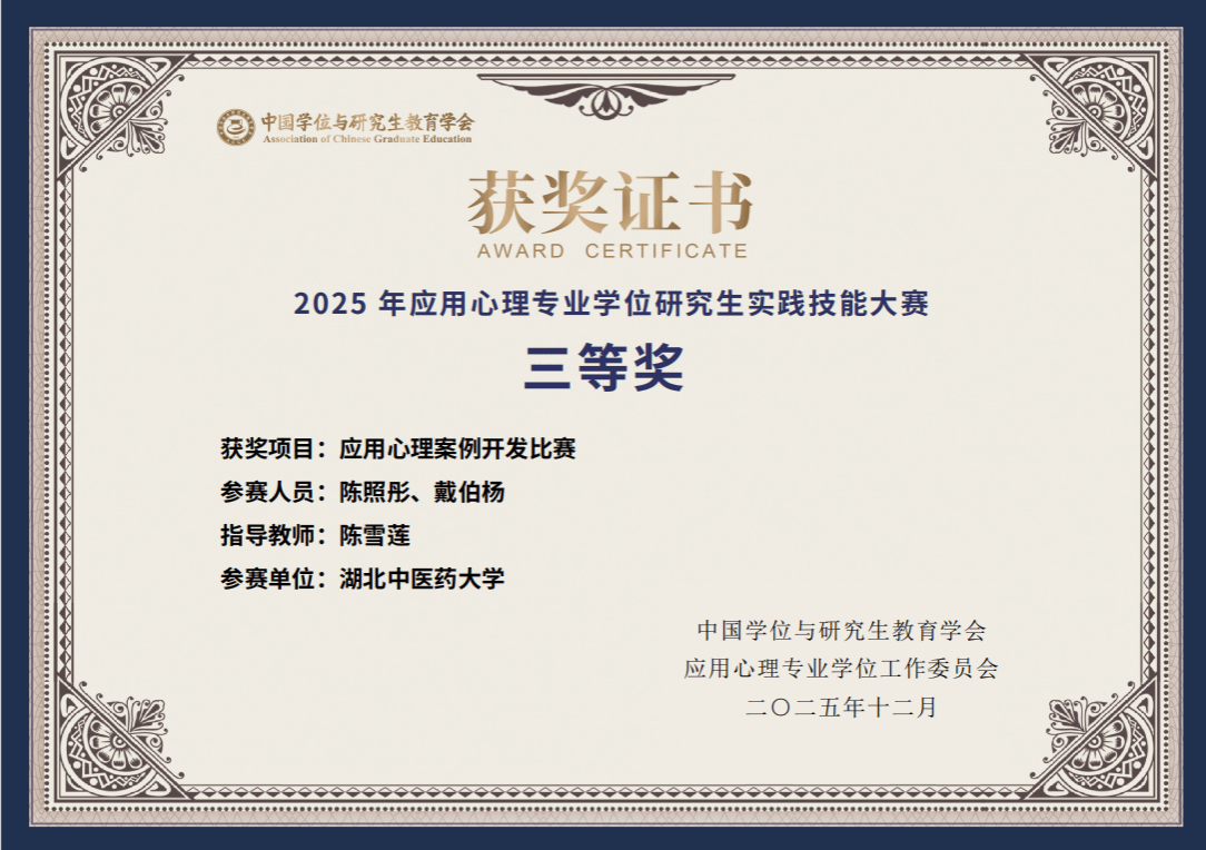 本网讯 近期,2025年应用心理专业学位研究生实践技能大赛在华东师范大学举行。赛事吸引了全国125所高校的478支队伍参赛。学校作为首次参赛的队伍,积极报名参赛,最终医学人文学院应用心理专业硕士陈照彤、戴伯杨同学(指导老师:陈雪莲副教授),在激烈竞争中脱颖而出,获“应用心理案例开发比赛”项目全国三等奖,实现了学校在该项国家级赛事中从“0”到“1”的历史性突破。