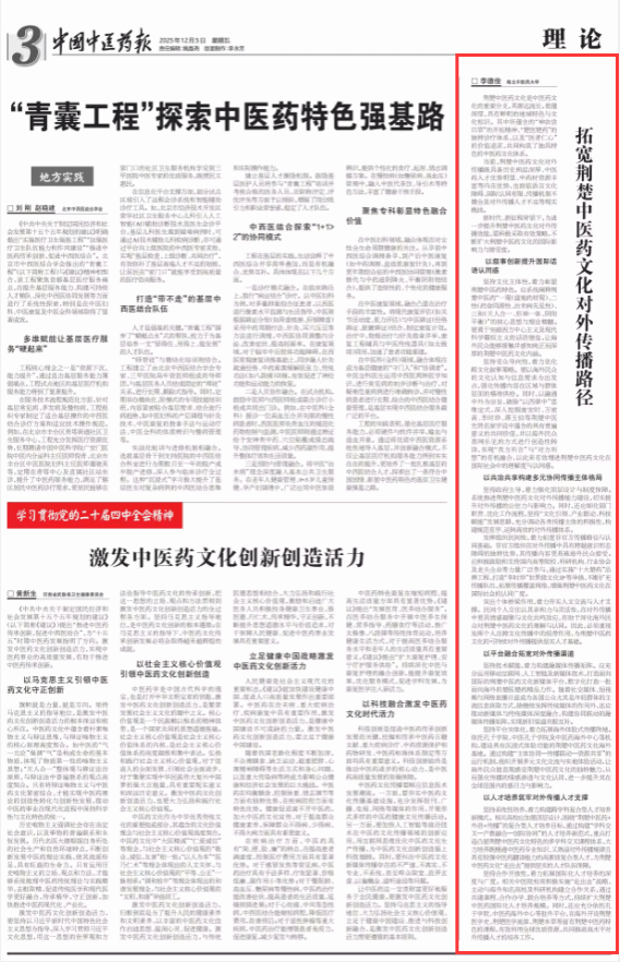 本网讯 12月5日,中国中医药报3版理论版刊发学校医学人文学院李德俊教授文章《拓宽荆楚中医药文化对外传播路径》。文章提出,要从以叙事创新提升国际话语认同感、以共治共享构建多元协同传播主体格局、以平台融合拓宽对外传播渠道、以人才培养筑牢对外传播人才支撑四个层面,进一步提升荆楚中医药文化对外传播效能,不断扩大荆楚中医药文化的国际影响力与接受度。