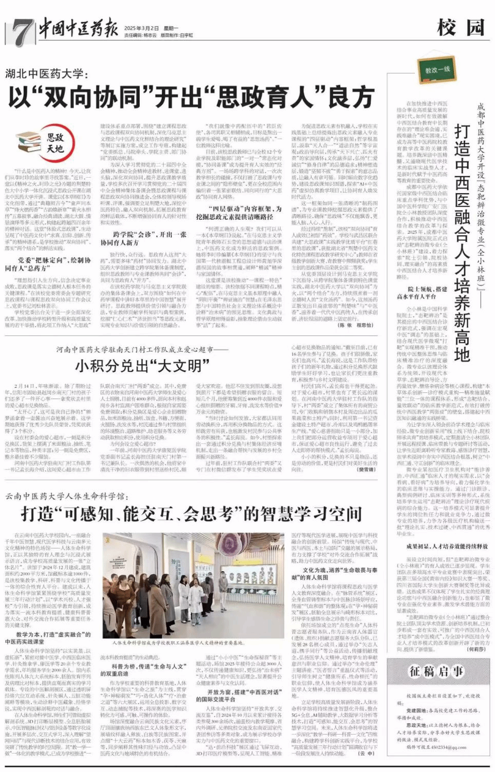 本网讯 3月2日,中国中医药报7版校园版以《湖北中医药大学:以“双向协同”开出“思政育人”良方》为题,对学校特色思政教育体系进行了详细报道。