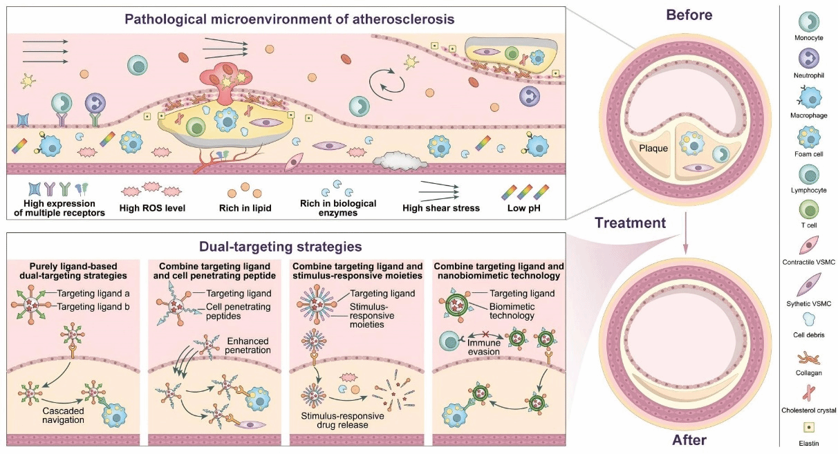 双靶向纳米药物递送系统不仅能更精准地将药物递送至病灶部位,还能实现对多个关键病理环节的协同干预,显著提升治疗效果。团队在《Bioactive Materials》(中科院1区Top期刊,影响因子20.3)上发表了题为“Advancements in dual-targeting nanoparticle strategies for enhanced atherosclerosis therapy: Overcoming limitations of single-targeting approaches”的综述,系统阐述了动脉粥样硬化在细胞层面的病理过程,分析了单靶向药物递送系统在应对复杂疾病时的不足。研究基于病理微环境与纳米药物递送系统特征,首次将双靶向药物递送策略系统归纳为纯配体双靶向、配体靶向与细胞穿膜肽结合、配体靶向与刺激响应元件结合以及配体靶向与纳米仿生技术结合四类,并进一步探讨了基于这四类双靶向策略的纳米平台在动脉粥样硬化治疗中所面临的挑战与未来发展方向,为下一代靶向纳米药物的设计提供了新思路。药学院2022级硕士研究生杨灿、2023级硕士研究生莫莉青和张桂芝讲师为论文共同第一作者,贺建华副教授和洪怡副教授为论文共同通讯作者。