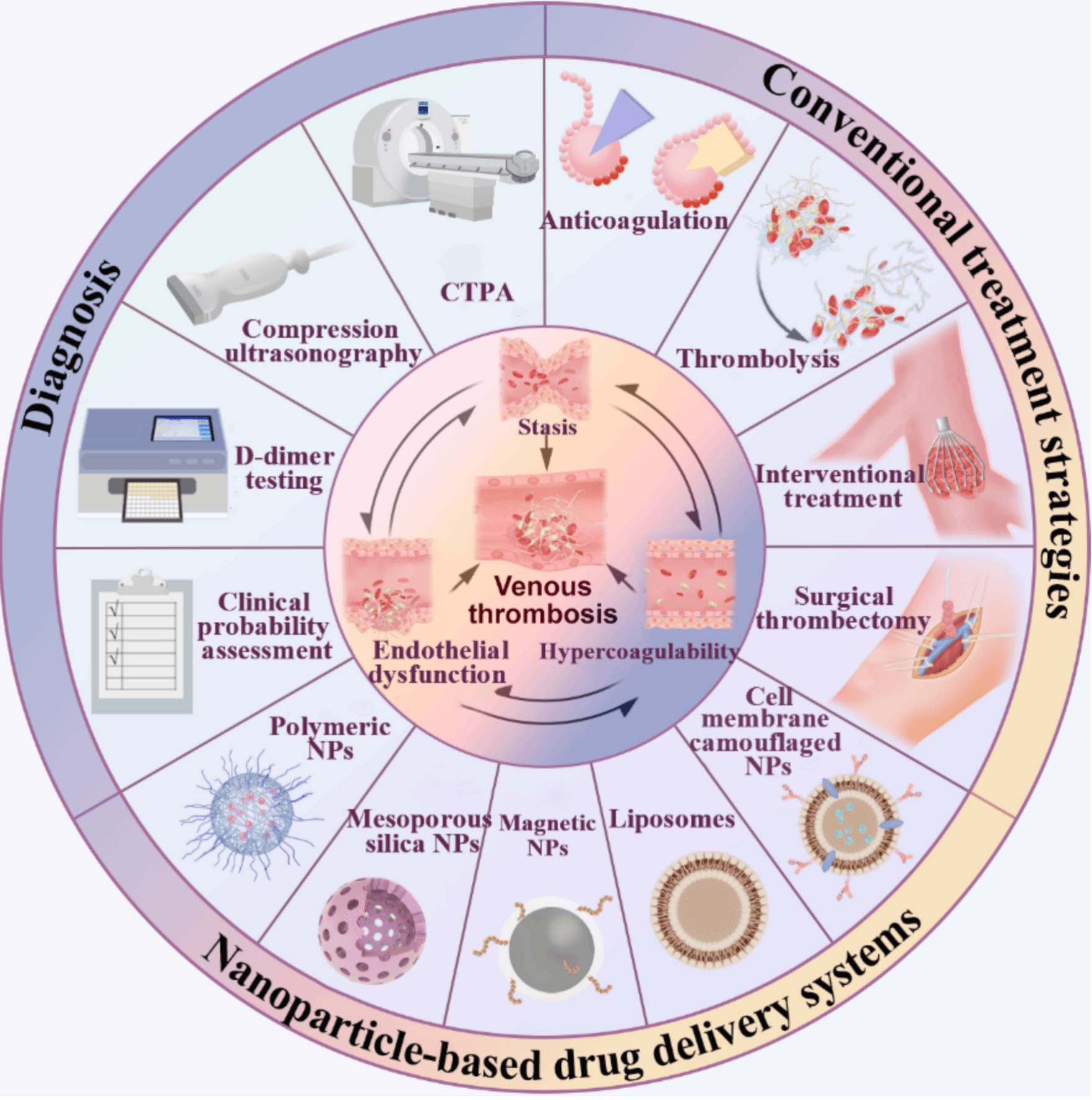 团队在《Chinese Chemical Letters》(中科院1区Top期刊,影响因子8.9)发表了题为“Drug delivery systems for the treatment of venous thrombosis”的综述论文,进一步分析了针对VT的新型药物递送系统研究进展,评估了该领域的发展前景与挑战。药学院2024级硕士研究生杨丽、龚愉鸿为论文共同第一作者,贺建华副教授为论文通讯作者。