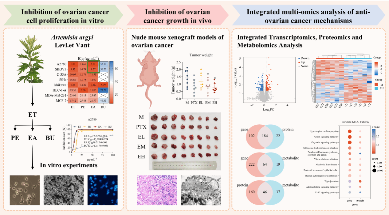 团队采用经典细胞模型、裸鼠移植瘤模型、DIA蛋白质组学等方法,从体外、体内到分子层面系统阐明了艾叶乙酸乙酯组分通过诱导凋亡与自噬、抑制增殖与迁移,并靶向JUN/MAPK10信号通路所发挥的抗卵巢癌作用。其多成分、多靶点的作用模式体现了中药整体干预的特点,为艾叶作为“妇科圣药”提供科学依据。该研究成果“Artemisia argyi ethyl acetate fraction suppresses ovarian cancer progression via JUN/MAPK10 signaling: An integrated multi-omics investigation”于2025年11月7日在药学领域权威期刊Phytomedicine(中科院一区,IF 8.3,Top期刊)发表,药学院硕士研究生刘贻天和喻天平为论文共同第一作者,药学院刘大会教授和桂春高级实验师为共同通讯作者。