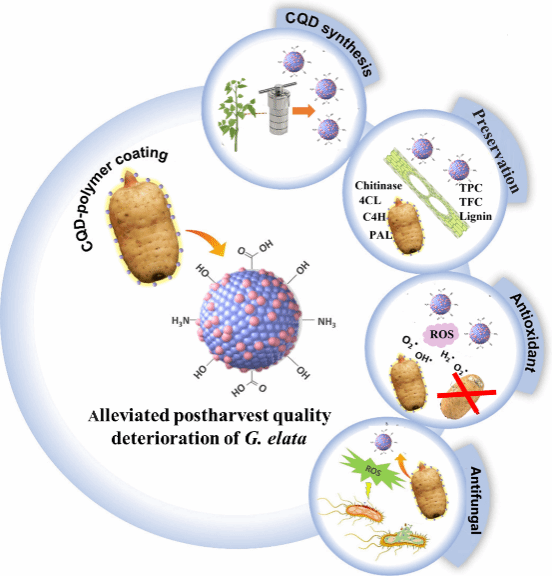 针对天麻采收后贮藏期短、易腐烂且化学保鲜剂存在安全风险等问题,团队以福白菊废弃茎叶为原料,制备出兼具抗氧化与抗菌活性的碳量子点,并进一步开发成可食性纳米保鲜涂层进行天麻保鲜。相关研究成果以“Edible coating of Chrysanthemum morifolium by-products derived carbon quantum dots alleviated postharvest quality deterioration of Gastrodia elata through regulating phenylpropanoid pathway”为题,发表于食品领域权威期刊《Food Packaging and Shelf Life》(中科院一区Top,影响因子10.6)。