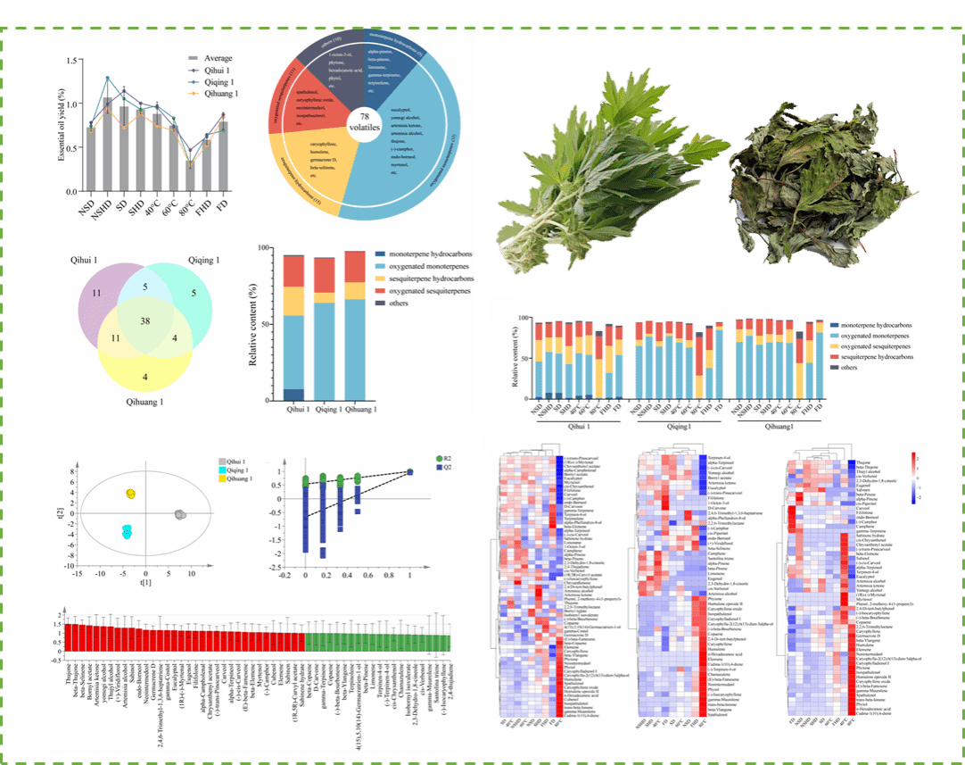针对蕲艾传统干燥方法粗放、品质不一等问题,团队系统研究了晒干、阴干、热风干燥等九种干燥方式对三个艾叶品种(蕲艾1号、蕲青1号、蕲黄1号)中酚酸、黄酮及挥发油成分的影响。相关研究成果以“Effects of drying methods on phenolic acids, flavonoids, and essential oils in three cultivars of Artemisia Argyi”为题,发表于食品领域知名期刊《Food Chemistry: X》(中科院一区Top,影响因子8.2)。