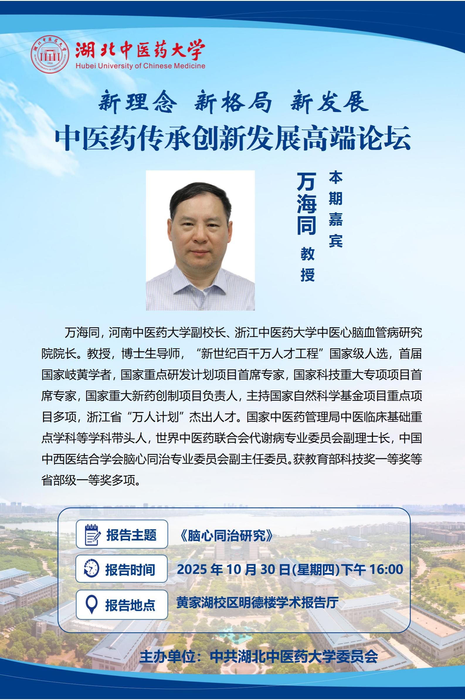 主讲人介绍:万海同,河南中医药大学副校长、浙江中医药大学中医心脑血管病研究院院长。教授,博士生导师,“新世纪百千万人才工程”国家级人选,首届国家岐黄学者,国家重点研发计划项目首席专家,国家科技重大专项项目首席专家,国家重大新药创制项目负责人,主持国家自然科学基金项目重点项目多项,浙江省“万人计划”杰出人才。国家中医药管理局中医临床基础重点学科等学科带头人,世界中医药联合会代谢病专业委员会副理事长,中国中西医结合学会脑心同治专业委员会副主任委员。获教育部科技奖一等奖等省部级一等奖多项。